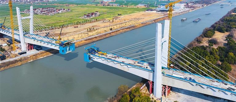 2月19日拍摄的沪渝蓉高铁泰州段桥梁工程施工现场。目前,该工程全面进入箱梁架设阶段,箱梁架设计划于10月全部完成。