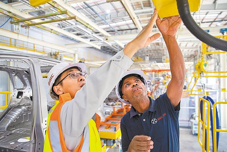 在南非东开普省北汽南非工厂,电工邦加尼(右)与中国同事方龙在焊装车间内工作。新华社记者 张誉东摄