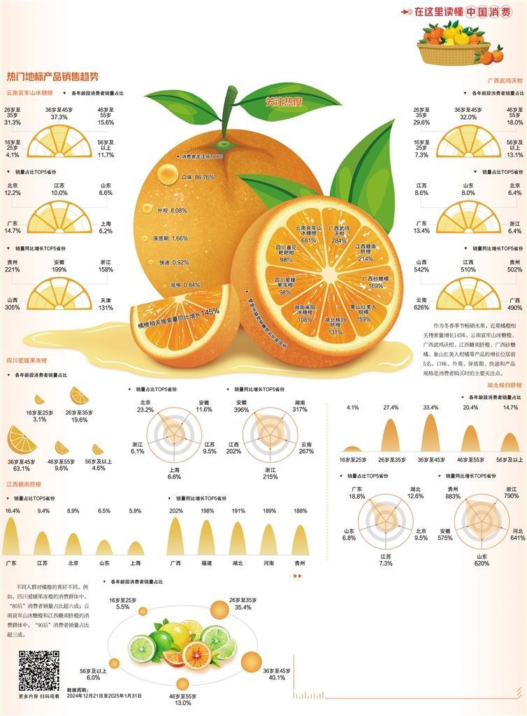 橘橙是广受欢迎的大众水果。近期,橘橙搜索量增长显著,成为冬春季节热销的水果之一,大量特色产区的橘橙产品源源不断销往全国各地,其中,云南哀牢山的冰糖橙、广西武鸣的沃柑、江西赣南的脐橙以及广西砂糖橘等尤其受到消费者青睐。