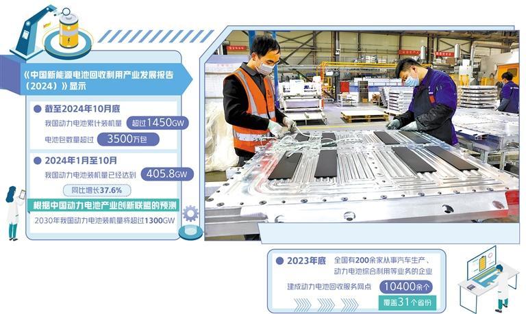 随着我国新能源汽车市场蓬勃发展,动力电池产业也迎来了前所未有的发展机遇。近期发布的《中国新能源电池回收利用产业发展报告(2024)》显示,我国新能源电池回收利用产能迅速增长,2023年综合利用量已达82.5万吨。截至2024年10月底,我国已培育了5批共148家规范企业,并在全国327个地市级行政区设立了1万余个回收服务网点。与此同时,产业发展也面临回收规范性不足等问题。动力电池回收产业如何拥抱机遇,迎接挑战?