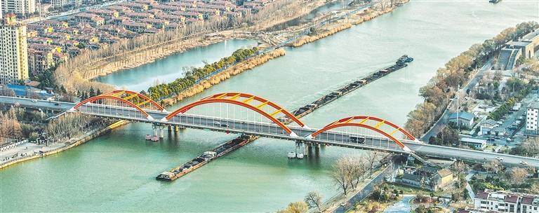 2月23日,货船行驶在京杭大运河江苏省宿迁市宿豫区段。眼下正值春耕备耕关键期,装载农资物品的货船在航道上航行。