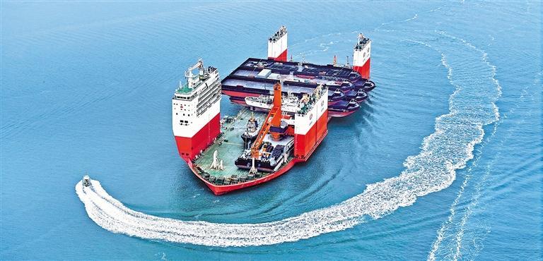 2月26日,新型半潜打捞工程船“华瑞龙”轮,在福建省宁德市三都澳灶屿水域装载13艘工程类船舶,即将出海前往非洲几内亚。