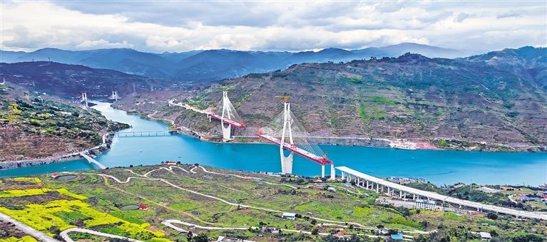 2月25日拍摄的新市金沙江特大桥建设现场。该大桥位于云南省昭通市绥江县南岸镇和四川省宜宾市屏山县新市镇,是连接两省的重要枢纽,通车后将密切区域经济合作。曾三东摄(中经视觉)