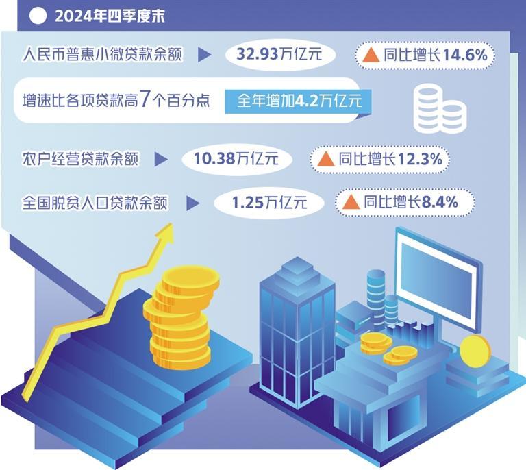 据中国人民银行统计,2024年四季度末人民币普惠小微贷款余额32.93万亿元,同比增长14.6%,增速比各项贷款高7个百分点,全年增加4.2万亿元。农户经营贷款余额10.38万亿元,同比增长12.3%。全国脱贫人口贷款余额1.25万亿元,同比增长8.4%。专家表示,普惠金融的增长,有效激发信贷需求,不断提升服务实体经济质效。
