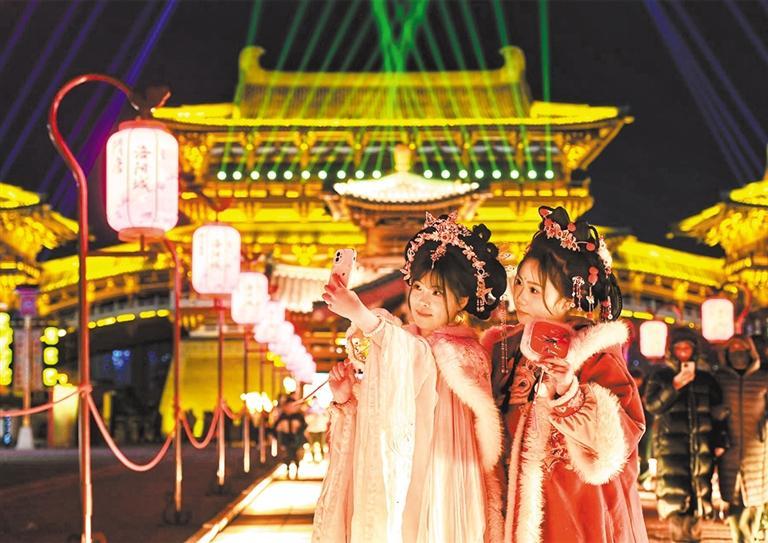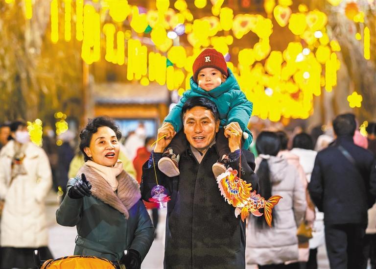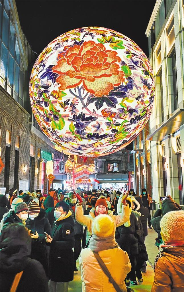 ◀2月18日,北京坊打造的彩灯吸引众多游客前来观赏打卡。