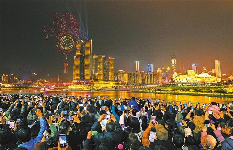 ▲2月11日,重庆,市民在长江边观看无人机表演。重庆的“无人机灯光表演”将科技创新融入传统节日,不仅呈现出视觉盛宴,也为假日消费增添了新动能。刘 嵩摄(中经视觉)