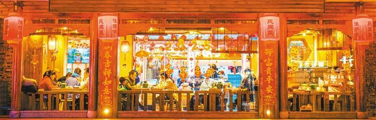 ◀2月20日,江苏省扬州市广陵区东关街,市民和游客在品尝当地美食。近年来,该市持续打造集夜食、夜购、夜游等于一体的“夜间经济”精品街区。