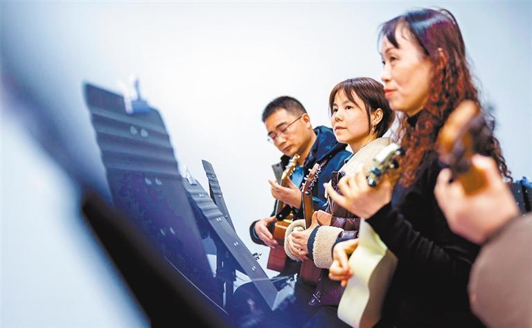 ▼2月24日晚,浙江省湖州市长兴县工人文化宫,企业职工在学习演奏尤克里里。谭云俸摄(中经视觉)