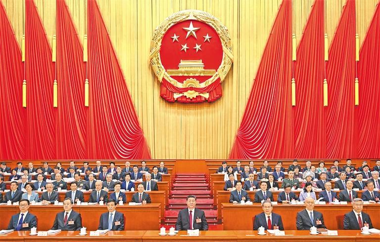 人民大会堂大礼堂气氛庄重热烈,主席台帷幕正中的国徽与会场穹顶上的五角星灯交相辉映。