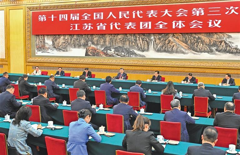 在听取大家发言后,习近平作了发言。他首先表示赞成政府工作报告,对江苏工作予以肯定,希望江苏落实好挑大梁的责任,努力取得新的更大成绩。