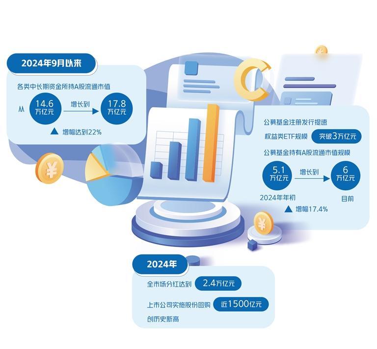 2024年9月以来,各类中长期资金所持A股流通市值从14.6万亿元增长到17.8万亿元,增幅达到22%。中长期资金保值增值和资本市场健康发展的良性互动将逐步形成。
