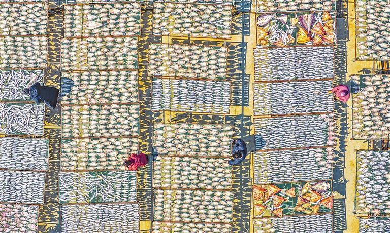 三月六日,江苏省宿迁市泗洪县龙集镇尚咀居水产品加工基地,工人正在晾晒鱼干。近年来,当地依托优质水域资源,大力发展鱼类养殖、加工产业,产品畅销国内外,带动农民增收致富。