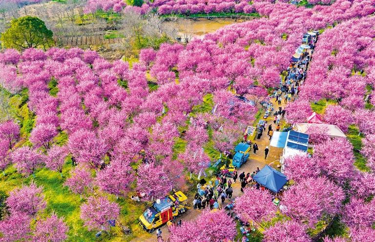 3月8日,浙江省绍兴嵊州市崇仁镇箭坑村美人梅竞相开放,引来众多游客观赏打卡。春日来临,大地复苏,不少市民走出家门,感受春天的气息。