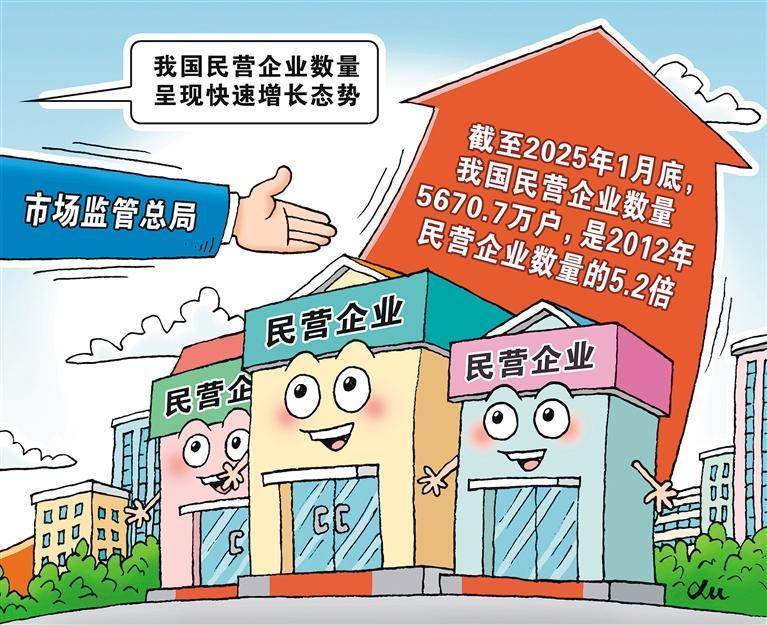 市场监管总局近日发布数据显示,截至2025年1月底,我国民营企业数量5670.7万户,是2012年民营企业数量的5.2倍。在国家高新技术企业中,民营企业从2012年的2.8万家增长到如今的42万多家,占比由62.4%提升至92%以上。民营企业是我国经济的重要组成部分,近年来各类帮扶政策陆续实施,民营企业数量大幅上涨,一直保持在全国登记在册企业总数的九成以上。与此同时,民营企业正在加快从传统劳动密集型转向技术驱动型,创新意识不断增强,已成为中国科技发展和技术创新的重要力量。接下来,相关部门要协同发力,从促进公平竞争、维护市场秩序、畅通融资渠道等方面着手。既要立足当下,解决民营企业急难愁盼问题,又要着眼长远,营造良好营商环境,让民营企业持续健康成长。 (时 锋)