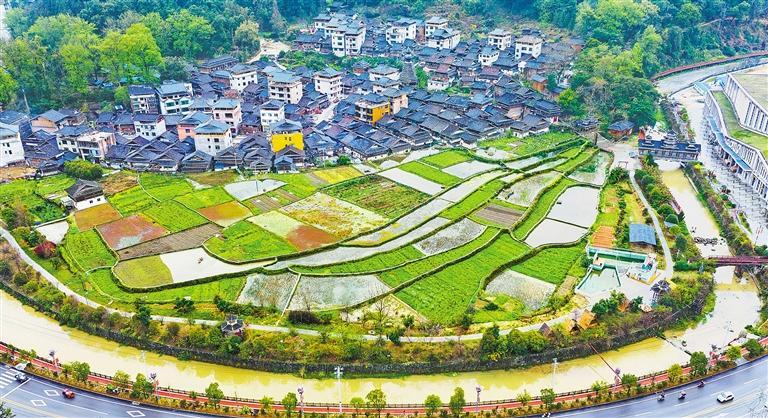 3月13日,烟雨中的贵州省黔东南苗族侗族自治州从江县丙梅街道銮里侗寨,田园、民居、风雨桥与青山绿水构成一幅春日画卷。