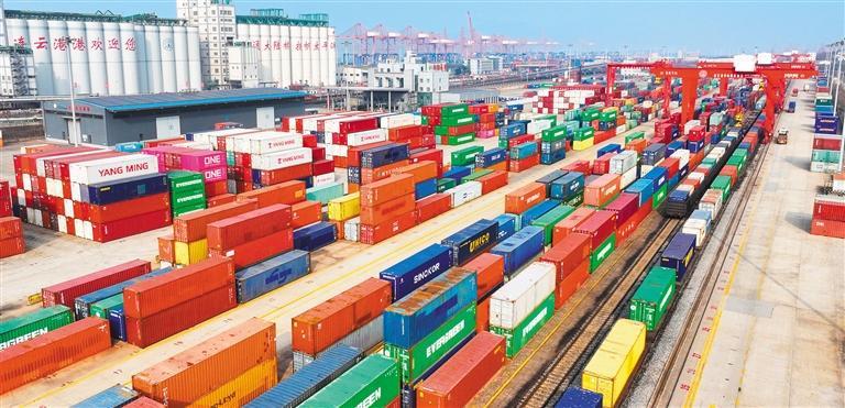 今年以来,中哈(连云港)物流合作基地积极加强国际货源组织,创新“班列+产业+贸易”的服务业态,提高中欧班列竞争力,中欧班列保持平稳增长态势。图为中哈(连云港)物流合作基地的繁忙景象。