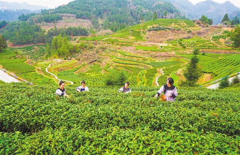 3月10日,湖南省吉首市马颈坳镇隘口村苗疆茶谷,茶农在采摘春茶。随着近期气温回升,15.5万亩湘西黄金茶进入春茶采摘期。梁永鸿摄(中经视觉)