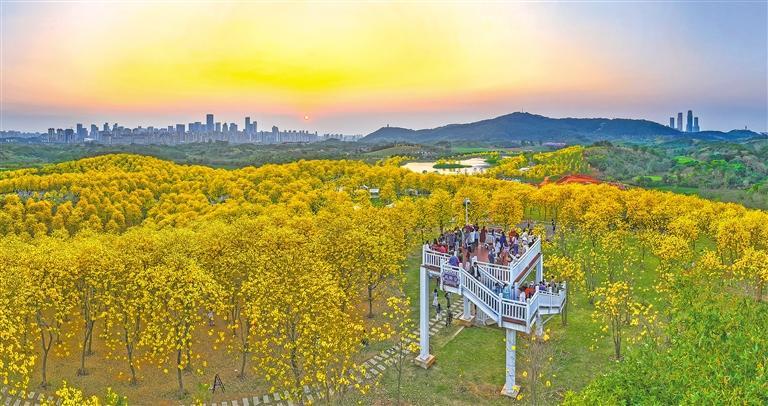 3月16日,游人在广西南宁市青秀山景区的黄花风铃园观景平台赏花观落日。入春以来,青秀山景区鲜花盛开,“赏花经济”持续升温,带动春季旅游消费。