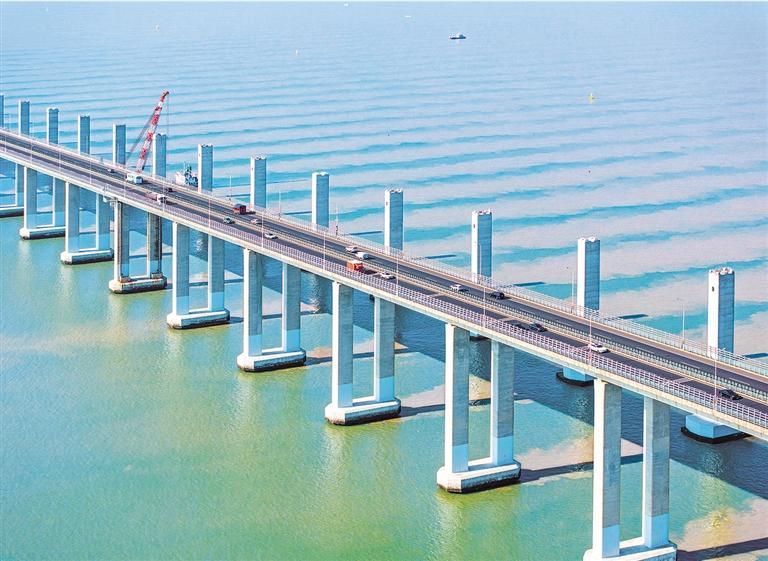 3月17日,浙江省宁波市象山港跨海大桥施工现场一派繁忙。该大桥是国内首座市域(郊)铁路跨海大桥,建成后将承担宁波主城区至象山县的中长距离出行功能。胡学军摄(中经视觉)