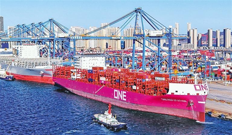 3月18日,货轮在山东港口青岛港装卸外贸集装箱。今年以来,青岛港开通2条到东南亚、地中海方向的“一带一路”航线,合计新开4条国际集装箱航线,加快世界一流海洋港口建设。