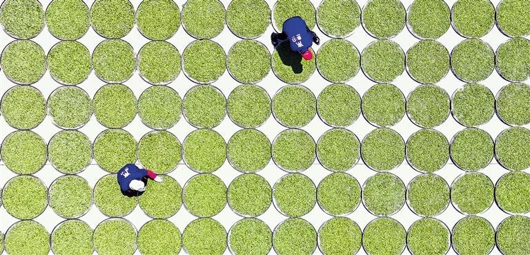 3月19日,福建省福鼎市前岐镇鼎白茶业基地,工作人员在晾晒白茶。近年来,当地大力推动白茶产业升级,助力农业增效和农民增收。王旺旺摄(中经视觉)
