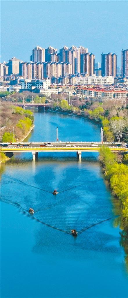 ▼3月19日,江苏省宿迁市泗洪县城区河道管护中心工作人员驾船在老汴河上保洁河道。