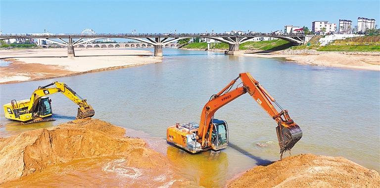 ▼3月19日,江西省吉安市永丰县恩江镇恩江河段,工人在对河道进行清淤疏浚。