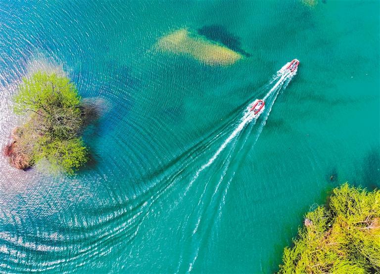 ◀3月11日,湖南省永州市道县祥霖铺镇两河口村,民间河长和志愿者驾驶快艇巡护河面。