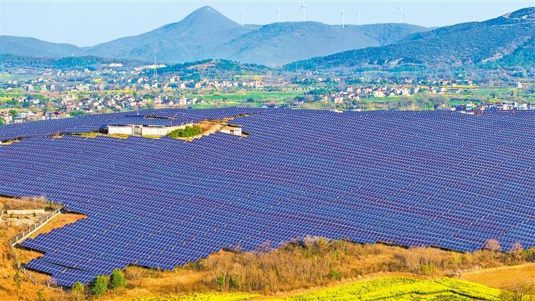 3月22日,安徽省无为市严桥镇,层叠律动的光伏矩阵与远山上旋转的风轮机组遥相辉映,勾勒出一幅新能源“风光”画卷。近年来,当地大力推动能源产业绿色低碳转型,助力实现生态效益和社会效益双赢。肖本祥摄(中经视觉)