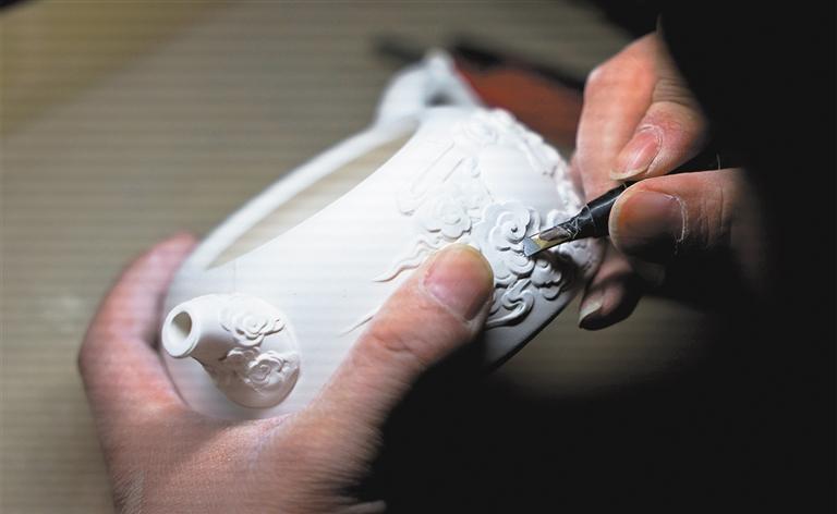▶2月15日,曲阳工匠将曲阳石雕传统雕刻技术与定瓷结合,制作出茶具、碗、笔筒等日用器具。
