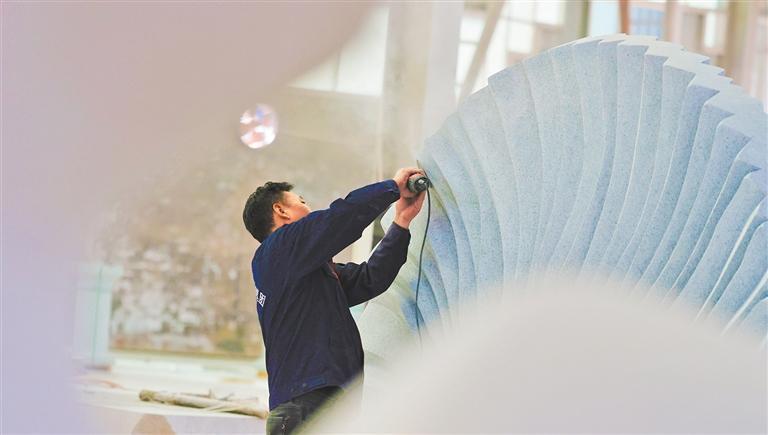 ▼2月15日,河北鑫特园林建筑雕塑有限公司员工在制作石雕。曲阳雕塑文化产业带目前集聚了2300多家企业,涉及石雕、铜雕、不锈钢雕等10余个门类3500多个品种。