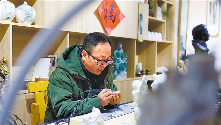 ◀2月15日,曲阳雕塑文化产业园,河北省工艺美术大师王昭辉在雕刻文创产品。他制作的石雕小狮子、玉石小金鱼、汉白玉饺子等小件文创产品,受到消费者喜爱。