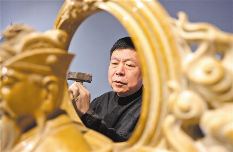 ▲2月15日,中国工艺美术大师、曲阳石雕项目代表性传承人刘红立在雕刻。他研究发明的石材拼接技艺填补了国内雕刻行业空白。