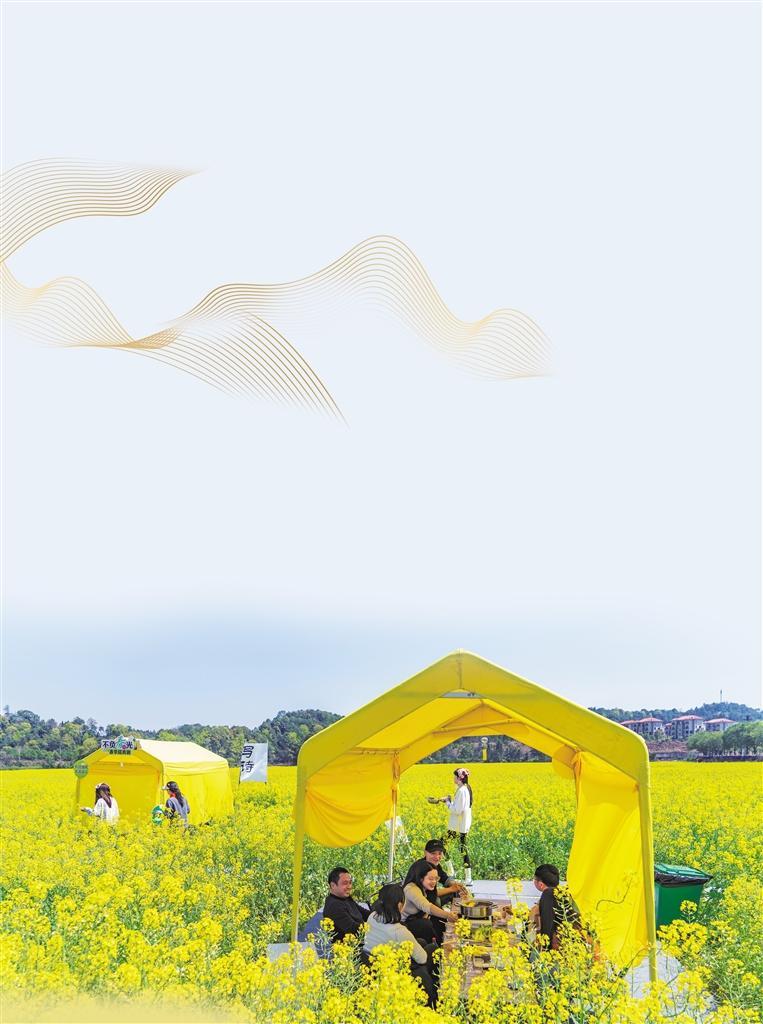 ▼3月20日,江西新余市仙女湖区河下镇垱头村,游客在油菜花田享用花田火锅。当地以花为媒,打造集游玩、体验、消费于一体的文旅融合新场景。赵春亮摄(中经视觉)