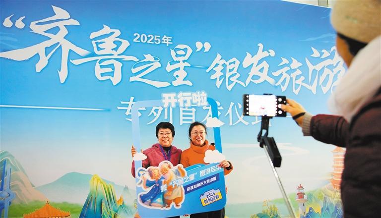 ◀3月9日,乘坐“齐鲁之星”银发旅游专列的旅客在山东烟台站候车大厅合影。从传统旅游模式升级为高端定制旅游服务,老年消费市场呈现精细化趋势。