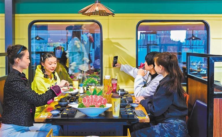 ▼3月24日,内蒙古鄂尔多斯市康巴什区,顾客在火车餐厅体验自助烤肉。退役火车车厢改建成的火车餐厅引入城市餐饮聚集区,丰富餐饮消费场景和产品供给。