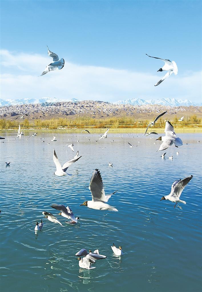 3月29日,甘肃省嘉峪关市讨赖河生态文化景区,大批候鸟长途跋涉汇集于此,河水悠悠、鸥鸟翩跹、雪山巍峨,勾勒出一幅充满生机的生态画卷,吸引市民和摄影爱好者观赏、拍照。
