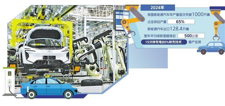 2024年,我国新能源汽车年产量首次突破1000万辆,占全球总产量的65%,连续10年居全球第一位。关键技术取得新突破,电动化基础进一步夯实,整车平均续航里程接近500公里,15分钟充电80%的快充技术量产应用。