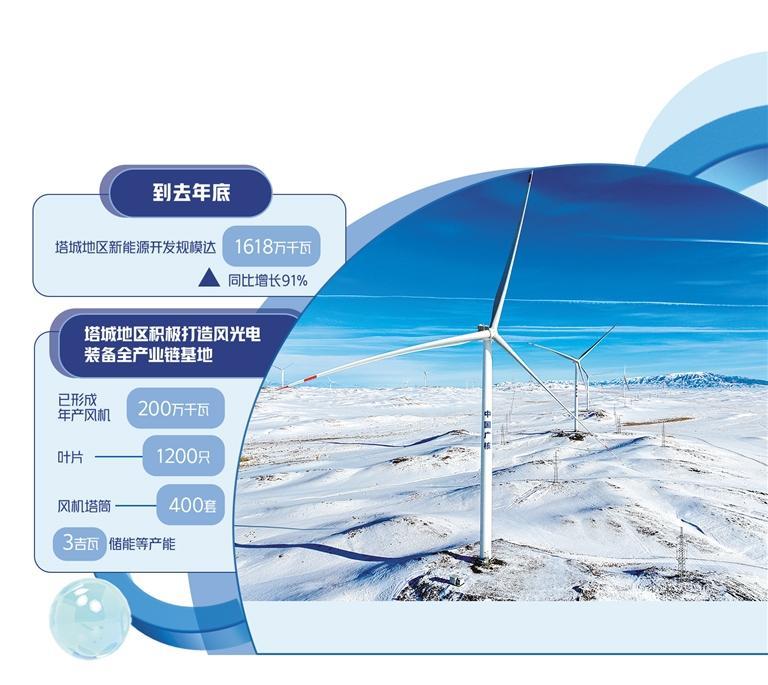 借助风能资源优势,塔城地区积极打造风光电装备全产业链基地,先后引进金风科技、三一重能、中国水电四局等企业,建设风电高端装备“碳中和”智慧园区、风机组装和叶片制造厂、塔筒制造厂、储能制造厂等,已形成年产风机200万千瓦、叶片1200只、风机塔筒400套、3吉瓦储能等产能。