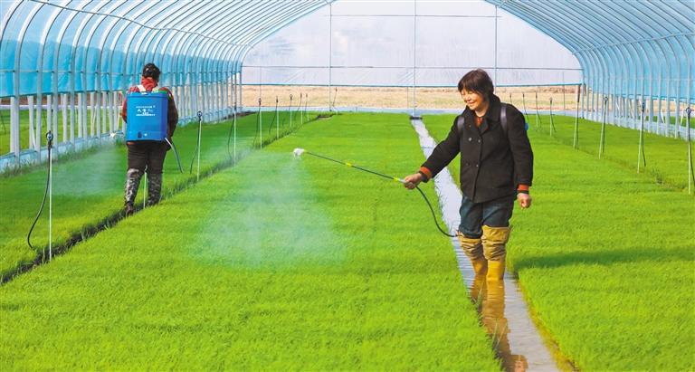 ▶4月1日,河南省信阳市光山县罗陈乡张楼村青龙河合作社,社员在田间给秧苗喷洒叶面肥。