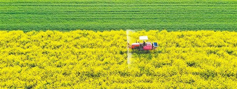 ▲3月25日,安徽省安庆市宿松县复兴镇,安徽农垦华阳河农场组织人员开展油菜菌核病防控作业。