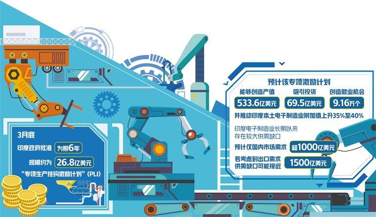 印度铁道、通信以及电子和信息技术部长阿什维尼·瓦伊什瑙表示,新版“生产挂钩激励计划”分为就业激励、资本支持和营业额激励三部分,目标是推动电路板、电容器、保险丝、电阻器等关键电子元件的本土化生产,进而大幅提升电子产品制造本土化率。按照企业扩大产能规模的达标程度,印度政府将给予不同程度的激励,同时还将推动劳动力、土地、海关、税收改革,以更好支持电子制造业发展。印度还支持外企通过建立“合资公司”的方式参与该计划。印度政府预计该专项激励计划能够创造533.6亿美元产值,吸引69.5亿美元投资,创造9.16万个就业机会,并推动印度本土电子制造业附加值上升35%至40%。