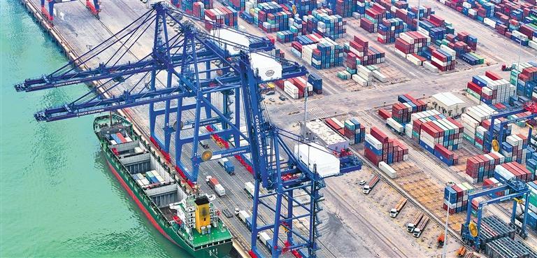 4月5日,福建省石狮市蚶江镇石湖港区,货轮正在有序装卸。近年来,石湖港引入多条外贸航线,2024年外贸集装箱吞吐量同比增长超13%,创历史新高。