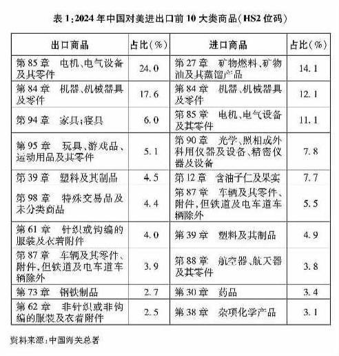 中美双边贸易互补性强。两国发挥各自比较优势,双边贸易呈互补关系(表1)。根据中国海关数据,2024年中国向美国出口前五大类商品为电机电气设备及其零附件、机械器具及零件、家具、玩具和塑料制品等,合计占比为57.2%。中国从美国进口前五大类商品为矿物燃料、机械器具及零件、电机电气设备及其零附件、光学仪器和大豆等含油子仁,合计占比为52.8%。机电产品在中美双边贸易中较为重要,产业内贸易特征较为明显。