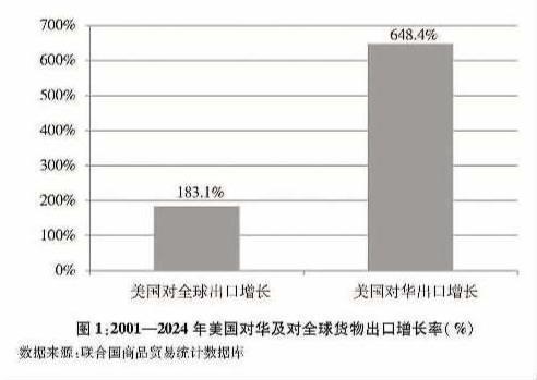 美国对华出口增速明显快于其对全球出口。中国加入世界贸易组织以来,美国对华出口快速增长,中国成为美国重要的出口市场。根据联合国统计数据,2024年美国对华货物出口额1435.5亿美元,较2001年的191.8亿美元增长648.4%,远远高于同期美国对全球183.1%的出口增幅(图1)。