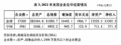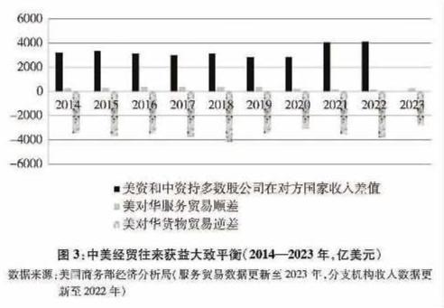 中美经贸合作为美国企业创造了大量商机和利润(表3)。中国拥有庞大的市场和不断升级的消费需求,例如,特斯拉在中国销量持续增长,2024年销量超过65.7万辆,同比增长8.8%,创下历史最高水平。十余家美资保险公司在华设有分公司。高盛、运通、美国银行、美国大都会人寿等美国金融机构作为中国金融机构的战略投资者,均取得了不菲的投资收益。美国商务部2024年8月的统计显示,2022年美国在华企业(拥有多数股权且资产、销售或净收入2500万美元以上)共1961家,总销售额4905.2亿美元,同比增长4.3%。