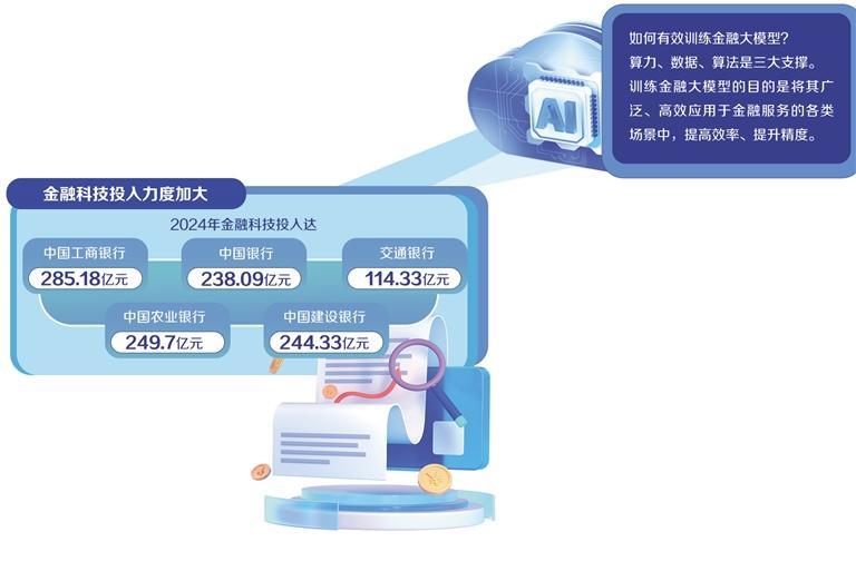 “人工智能+”为金融服务带来了哪些变革?这不仅是市场高度关注的话题,也是上市金融机构热议的话题。近期陆续披露的上市银行2024年年报数据显示,多家机构持续加大金融科技投入力度。中国工商银行、中国农业银行、中国银行、中国建设银行、交通银行2024年金融科技投入分别达285.18亿元、249.7亿元、238.09亿元、244.33亿元、114.33亿元。