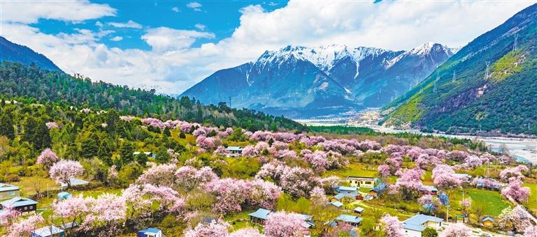 4月10日,西藏自治区林芝市波密县扎木镇,桃花竞相绽放。
