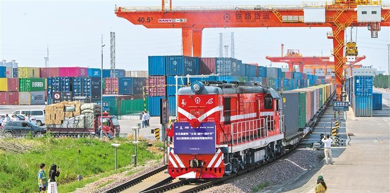 4月11日,一列满载100个标准集装箱的货运班列从浙江义乌西站开出,驶向新疆喀什北口岸,标志着长三角首趟出口货物铁公联运班列开行。