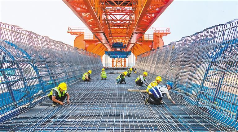 ◀4月10日,位于广东东莞的深江高铁跨沿江高速特大桥建设现场,工人们在有序施工。